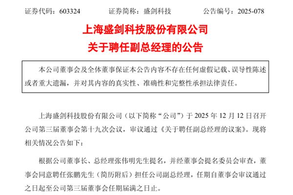 上海盛剑科技股份有限公司(简称:盛剑科技)公告称,根据公司董事长、总经理张伟明先生提名,并经董事会提名委员会审查,董事会同意聘任张鹏先生担任公司副总经理,任期自董事会审议通过之日起至公司第三届董事会任期届满之日止。