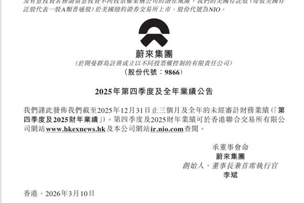 3月10日,蔚来集团(简称:蔚来)发布2025年第四季度及全年财务业绩。2025年第四季度,蔚来实现营收346.5亿元,同比增长75.9%,创历史新高。第四季度净利润为2.83亿元,实现公司成立以来首次单季盈利,相比之下,2024年同期净亏损71.12亿元。