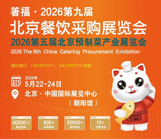 作为北京餐饮行业*具知名度与影响力的年度盛会之一,箸福·2026第九届北京餐饮采购展览会暨2026第五届北京预制菜产业展览会(以下简称北京餐饮采购展),正式定档,将于2026年5月22-24日在北京·中国国际展览中心(朝阳馆)举办,现场展出面积40000㎡,预计将有800+参展商,50000+参观观众共同探讨餐饮行业破局谋变之路!