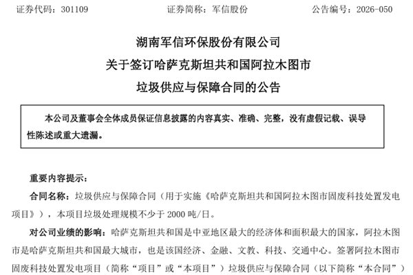 军信股份表示,签署阿拉木图市固废科技处置发电项目(简称“项目”或“本项目”)垃圾供应与保障合同(下称“本合同”)是公司积极践行国家“一带一路”倡议,弘扬“中国中亚精神”,落实公司战略发展规划的重要举措。项目若顺利实施,将是继公司成功签约吉尔吉斯共和国比什凯克市垃圾科技处置发电项目(规划垃圾处理规模3000吨/日)、奥什市垃圾科技处置项目(规划垃圾处理规模2000吨/日)、伊塞克湖州垃圾科技处置项目(总体规划垃圾处理规模2000 吨/日)后,在海外市场拓展方面取得的又一重大成果,有助于扩大公司海外业务版图,在国内市场相对饱和、竞争激烈的市场环境中找到新的突破口,为公司提供新的业绩增长点,提升公司的盈利能力和核心竞争力。