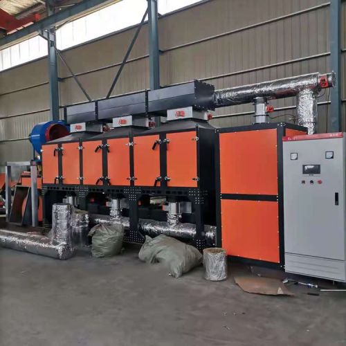 吸附浓缩-催化燃烧法,该设备采用多气路连续工作,设备多个吸附床可交替使用。含有机物的废气经风机的作用,经过活性炭吸附层,有机物质被活性炭的作用力截留在其内部,吸附去处效率达80,吸附后的洁净气体排出;经过一段时间后,活性炭达到饱和状态时,停止吸附,此时有机物已被浓缩在活性炭内,之后按照PLC自动控制程序将饱和的活性炭床与脱附后待用的活性炭床进行交替切换。CO(催化氧化设备)自动升温将热空气通过风机送入活性炭床使碳层升温将有机物从活性炭中“蒸”出,脱附出来的废气属于高浓度、小风量、高温度的有机废气。