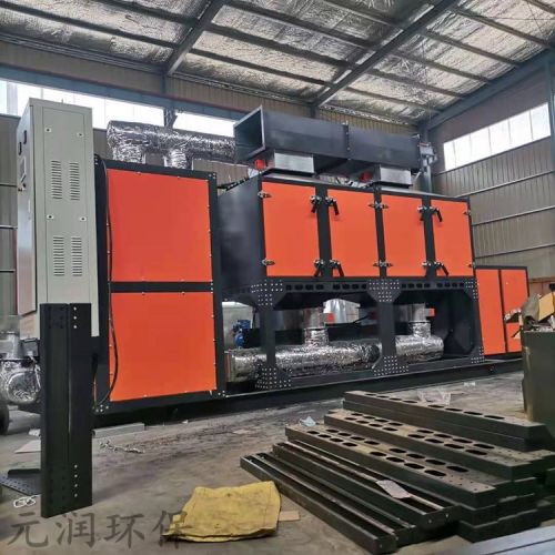 3. 活性炭吸附段:经过预处理后的废气进入活性炭吸附箱,气体进入吸附箱后,气体中的有机物质被活性炭吸附而着附在活性炭的表面,从而使气体得以净化,净化后的气体再通过风管接入下处理设备。