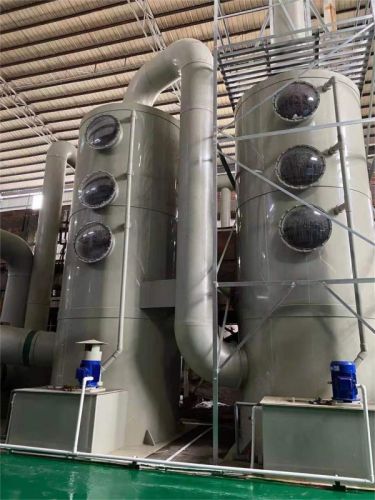 本设备分单塔体和双塔体。采用圆形塔体,用法兰分段联接而成。具体由贮液箱、塔体、进风段、喷淋层、填料层、旋流除雾层、出风锥帽、观检孔等组成。