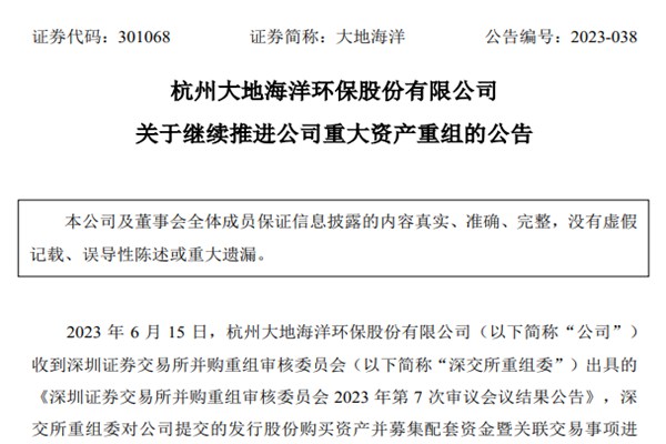 6月15日晚间,杭州大地海洋环保股份有限公司(简称:大地海洋)发布公告,表示将继续推进公司重大资产重组,即收购浙江虎哥环境有限公司(下称“虎哥环境”)有关事宜,势必要促成2023年垃圾分类领域并购“第一单”。 环保在线了解到,该笔交易已经在6月15日被深交所正式叫停,深交所给出的理由是...