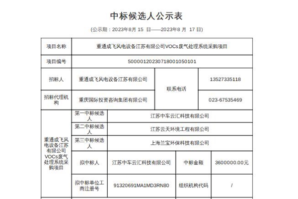 中国招标投标公共服务平台发布重通成飞风电设备江苏有限公司VOCs废气处理系统采购项目中标候选人公示,第一中标候选人为江苏中车云汇科技有限公司。 重通成飞风电设备江苏有限公司VOCs废气处理系统采购项目中标候选人公示...