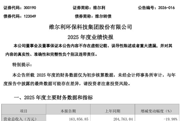 维尔利环保科技集团股份有限公司(简称:维尔利)近日正式发布《2025年度业绩快报》。报告期内,维尔利实现营业总收入16.39亿元,同比下降19.98%;归属于上市公司股东的净利润-3.48亿元,同比减亏;基本每股收益-0.44元。图源:维尔利公告 维尔利表示,报告期内,公司积极布局生物天然气、生物燃料油等绿色能源业务,相关项目稳步推...
