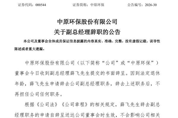 中原环保股份有限公司(简称:中原环保)公告称,公司近日收到副总经理薛飞先生提交的书面辞呈。因到法定退休年龄,薛飞先生申请辞去公司副总经理职务,辞去上述职务后,不再担任公司任何职务。 截至本公告披露日,薛飞先生未持有中原环保股份,不存在应当履行而未履行的承诺事项。图源:中原环保公告 本文转载自第三方平台,转发此文目的在于促进信息交流...