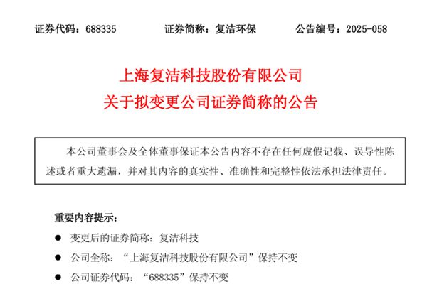 上海复洁科技股份有限公司(简称:复洁环保)公告称,公司拟变更证券简称为“复洁科技”,全称“上海复洁科技股份有限公司”保持不变,证券代码“688335”保持不变。 据悉,复洁环保于2025年5月完成工商变更登记和备案手续,公司全称已正式变更为“上海复洁...
