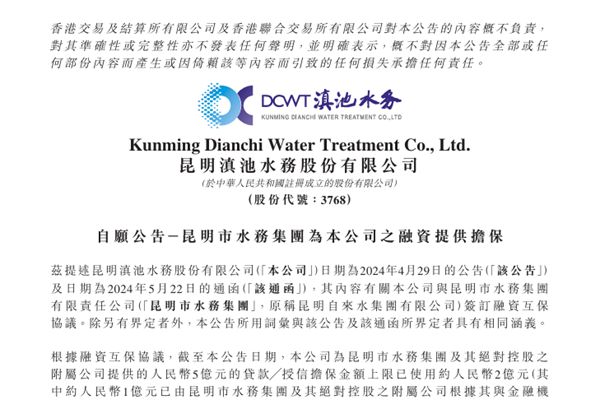昆明滇池水务股份有限公司(简称:滇池水务)公告称,11月11日,公司与昆明市水务集团签订了《融资担保框架协议》,由昆明市水务集团为本公司及本公司绝对控股之附属公司的贷款/授信单方面额外增加提供累计不超过人民币5亿元的担保额度,该担保额度可循环使用。 滇池水务表示,担保范围为本公司及本公司绝对控股之附属公司签订之融资合同及昆明市水务集...