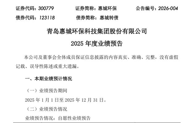 青岛惠城环保科技集团股份有限公司(简称:惠城环保)近日发布《2025 年度业绩预告》。报告期内,惠城环保实现归属于上市公司股东的净利润盈利5,500.00万元–7,000.00万元,上年同期盈利4,259.97 万元,同比增长29.11%- 64.32%;扣除非经常性损益后的净利润盈利 4,200.00万元–5...