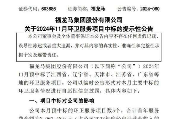 福龙马集团股份有限公司(简称:福龙马)公告称,公司2024年11月预中标了江西省、辽宁省、天津市、江苏省、广东省等地的环卫服务项目,共5个,合计首年服务费金额为2,067.48万元(占公司2023年度经审计营业收入的0.40%);合同总金额为5,249.54万元。 截至本公告披露日,福龙马2024年环卫服务项目中标数47个,合计首年...