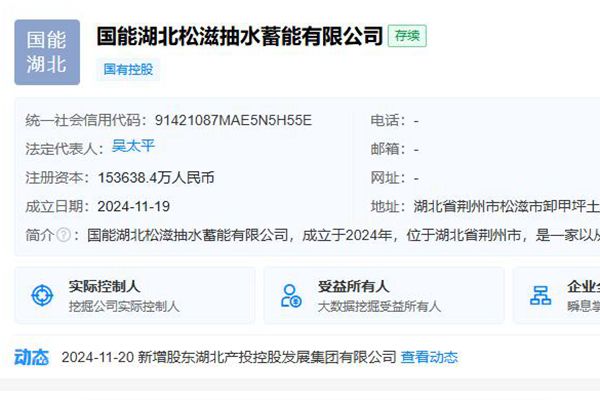 11月19日,国能湖北松滋抽水蓄能有限公司正式成立,注册资本153638.4万人民币,经营范围包括: 【许可项目】水力发电;供电业务;旅游业务;发电业务、输电业务、供(配)电业务;水产养殖;道路货物运输(不含危险货物);建设工程施工;餐饮服务;住宿服务。(依法须经批准的项目,经相关部门批准后方可开展经营活动,具体经营项目以相关部门批...