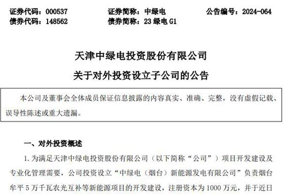 天津中绿电投资股份有限公司(简称:中绿电)公告称,公司拟对外投资设立子公司——中绿电(烟台)新能源发电有限公司,负责烟台牟平 5 万千瓦农光互补等新能源项目的开发建设,注册资本为 1000 万元,并于近日获得营业执照。 中绿电表示,公司投资设立新公司,旨在加快推进烟台牟平 5万千瓦农光互补项目开发建设及后续资...