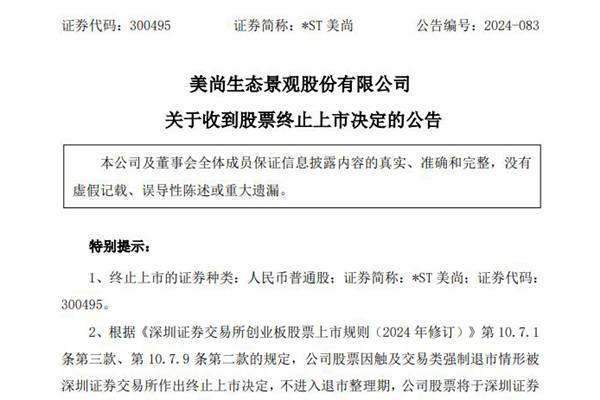 美尚生态景观股份有限公司(简称:*ST美尚,原“美尚生态”)9月13日发布《关于收到股票终止上市决定的公告》,表示公司股票因触及交易类强制退市情形被深圳证券交易所作出终止上市决定,不进入退市整理期,公司股票将于深圳证券交易所作出终止上市决定后十五个交易日内摘牌。 公告显示,美尚生态退市系在 2024 年 4 ...