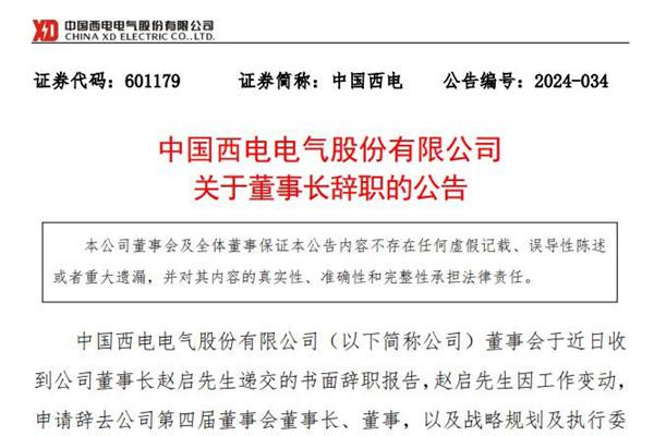9月13日,中国西电发布公告称,公司董事会于近日收到董事长赵启的书面辞职报告。公告指出,赵启因工作变动,申请辞去公司第四届董事会董事长、董事,以及战略规划及执行委员会主席、委员,提名委员会委员职务。辞职后,赵启将不再在公司担任任何职位,且其辞职申请自送达董事会之日起即生效。 截止公告日,赵启并未持有中国西电的任何股份。该公司将依据有...