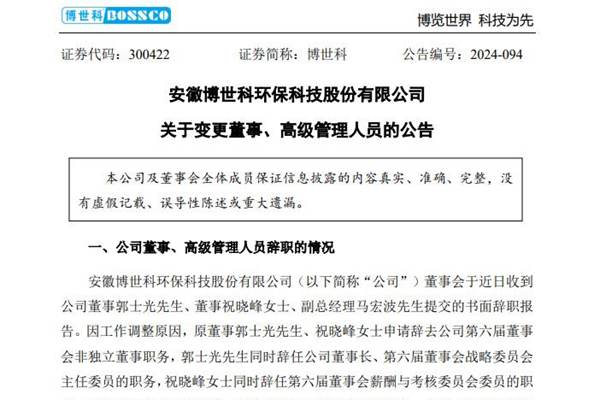 安徽博世科环保科技股份有限公司(简称:博世科)近日发布公告称,公司董事会于近日收到董事郭士光先生、董事祝晓峰女士、副总经理马宏波先生提交的书面辞职报告。 因工作调整原因,原董事郭士光先生、祝晓峰女士申请辞去公司第六届董事会非独立董事职务,郭士光先生同时辞任公司董事长、第六届董事会战略委员会主任委员的职务,祝晓峰女士同时辞任第六届董事...
