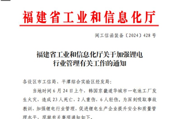漳州市工业和信息化局关于加强锂电行业管理有关工作的通知漳工信电子〔2024〕134号 各县(区)工信局,漳州开发区、常山开发区、古雷开发区、漳州台商投资区、漳州高新区经发局(科经局): 为贯彻落实省工信厅《关于加强锂电行业管理有关工作的通知》(闽工信函装备〔2024〕428号)(附件1)文件精神,深刻吸取近期锂电池生产企业事故教训,有...