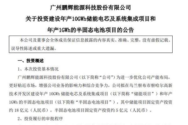 广州鹏辉能源科技股份有限公司发布《关于投资建设年产10GWh储能电芯及系统集成项目和年产1GWh的半固态电池项目的公告》,拟投资18+5(亿元)。 公告称,公司将在乌兰察布市注册设立具有独立法人资格的项目公司作为实施主体,储能项目计划于 2024 年 9 月开工,2025 年 10 月投产;半固态电池项目计划于 2025 年 5 月...