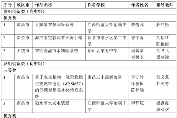 江西省生态环境厅公示第二十一届全国中学生水科技发明比赛江西省获奖名单,获奖项目包括智能浇灌节水辅助系统、基于水生植物一沉积物微生物燃料电池(AP-SMFC)的低碳耗黑臭水体治理系统、微水节水发电装置、通过雨水收集与空气集水供应植物栽培、便携式磁性生物炭净水滤芯材料的研发、针对萍水河水体富营养化及水华的治理、雨水接收保湿器、智能家居水浇...