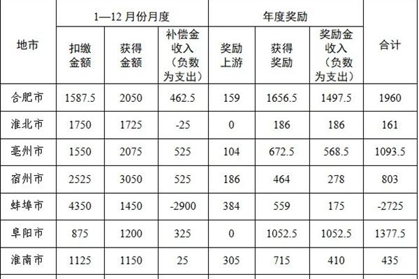 按照《安徽省生态环境厅 安徽省财政厅关于印发安徽省地表水断面生态补偿办法的通知》(皖环发〔2022〕19号)(以下简称办法)和《安徽省生态环境厅 安徽省财政厅关于印发沱湖流域上下游横向生态补偿实施方案的通知》(皖环发〔2019〕88号)要求,现将2023年度全年各市地表水断面和沱湖流域上下游横向生态补偿结果分别通报如下: No.1 ...
