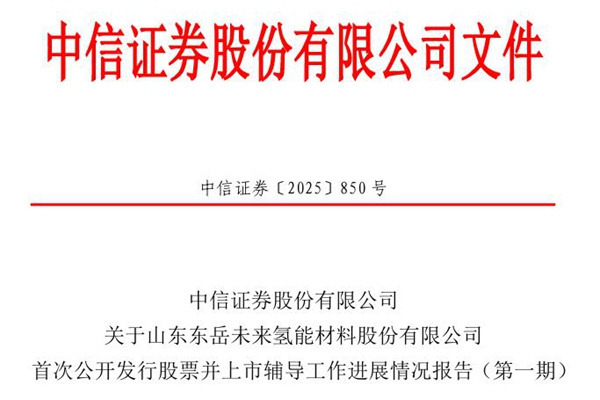 中信证券发布《关于山东东岳未来氢能材料股份有限公司首次公开发行股票并上市辅导工作进展报告(第一期)》。图源:中信证券 2025年3月10日,中信证券与未来材料签署了辅导协议,正式向中国证券监督管理委员会山东监管局报送辅导备案申请材料,并于2025年3月12日获得受理。2025年4月10日,中信证券向中国证券监督管理委员会山东监管局报...