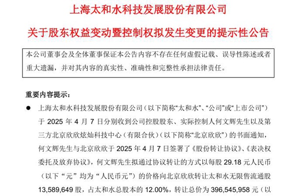 整个3月,太和水一边宣布面临退市风险,一边停牌筹划控制权变更事项。直到4月8日,上海太和水科技发展股份有限公司连发公告,确认了本次变更事项。图源:太和水公告 上海太和水科技发展股份有限公司于2025 年 4 月7日分别收到公司控股股东、实际控制人何文辉先生以及第三方北京欣欣炫灿科技中心(有限合伙)的书面通知,何文辉先生与北京欣欣于2...