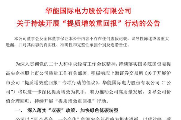 2025年04月08日,华能国际电力股份有限公司发布《 关于持续开展“提质增效重回报”行动的公告》。图源:华能国际公告 根据公告,2024年公司新能源项目资本支出448 亿元,投产新能源项目可控装机容量9417.7兆瓦,低碳清洁能源装机占比超过35%。 2025 年新能源项目计划资本支出超 500亿元,在&...