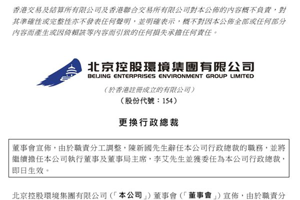 3月27日,北京控股环境集团发布公告,由于职责分工调整,陈新国先生辞任公司行政总裁的职务,并将继续担任公司执行董事及董事局主席,李艾先生并获委任为公司行政总裁,即日生效。图源:北京控股环境集团公告 申明:本站发布此信息的目的在于传播更多信息,与本站立场无关。并且郑重提示所有阅读者,股市有风险,投资需谨慎,本文不作为任何投资的参考意见...