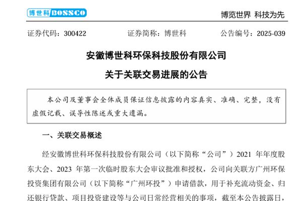 3月21日,安徽博世科环保科技股份有限公司(简称:博世科)发布《关于关联交易进展的公告》。公告显示,博世科已决议通过《关于调整关联借款相关事项暨关联交易的议案》。经与广州环保投资集团有限公司(以下简称“广州环投”)沟通协商,本次公司补充质押所持有的全资孙公司广西科丽特环保科技有限公司、广西博测检测技术服务有限公...
