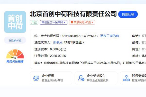 近日,北京首创中荷科技有限责任公司于2025年2月26日注册成立,注册资本为8000万元,经营范围: 【一般项目】技术服务、技术开发、技术咨询、技术交流、技术转让、技术推广;环保咨询服务;水污染治理;环境保护专用设备制造;环境保护专用设备销售;污水处理及其再生利用;信息系统集成服务;软件开发;软件销售;计算机软硬件及辅助设备批发;通...