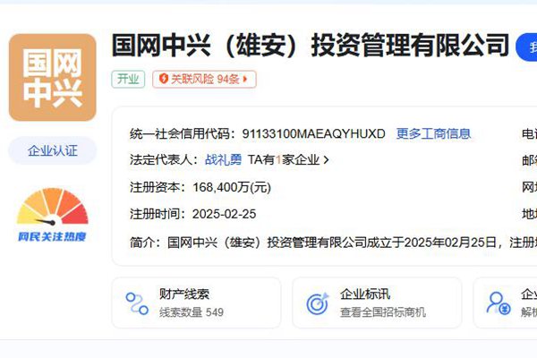 近日,国网中兴(雄安)投资管理有限公司成立,法定代表人为战礼勇,注册资本16.84亿人民币,经营范围: 【一般项目】自有资金投资的资产管理服务;物业管理;物业服务评估;住房租赁;酒店管理;企业管理咨询;技术服务、技术开发、技术咨询、技术交流、技术转让、技术推广;电动汽车充电基础设施运营;停车场服务;信息咨询服务(不含许可类信息咨询服...