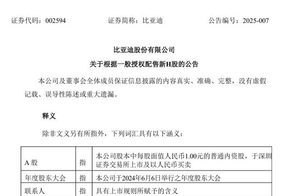 3月4日,比亚迪股份有限公司(简称:比亚迪)发布《关于根据一般授权配售新H股的公告》。公告显示,比亚迪和配售代理于2025年3月3日(收市时间后)订立了配售协议,配售股份将根据一般授权配发及发行。假设配售股份全数配售,配售所得款项总额预计约为435.09亿港元,扣除佣金和估计费用后,配售所得款项净额预计约为433.83亿港元,拟用作集...