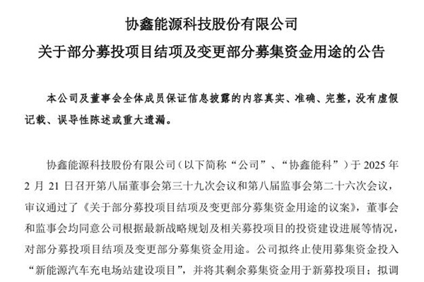 2025年02月22日,协鑫能源科技股份有限公司发布《关于部分募投项目结项及变更部分募集资金用途的公告》、《变更部分募集资金用途的可行性分析报告》等。图源:协鑫能源公告 公告表示: 公司拟终止使用募集资金投入“新能源汽车充电场站建设项目”,并将其剩余募集资金用于新募投项目; 拟调整“分布式光伏...
