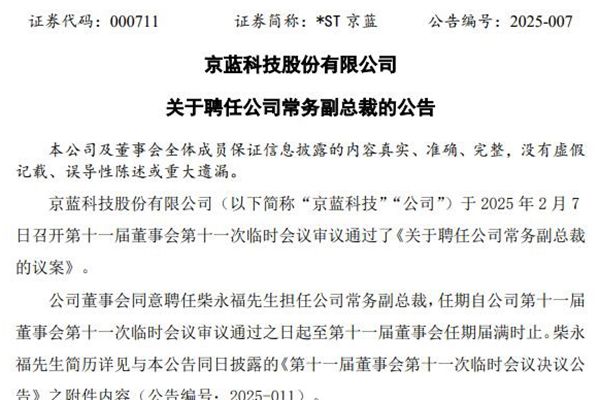 京蓝科技股份有限公司(简称:*ST京蓝)公告称,公司于 2025 年 2 月 7日召开第十一届董事会第十一次临时会议审议通过了《关于聘任公司常务副总裁的议案》。*ST京蓝董事会同意聘任柴永福先生担任公司常务副总裁,任期自公司第十一届董事会第十一次临时会议审议通过之日起至第十一届董事会任期届满时止。图源:*ST京蓝公告 柴永福先生个人...