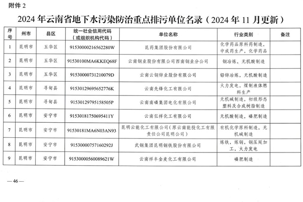 云南省生态环境厅关于印发2024年云南省地下水污染防治重点排污单位名录的通知 各州、市生态环境局: 为贯彻落实《地下水管理条例》关于“地方人民政府生态环境主管部门应当按照国务院生态环境主管部门”的规定,我厅对2024年云南省地下水污染防治重点排污单位名录进行了更新。 现将88家地下水污染防治重点排污单位名录印...
