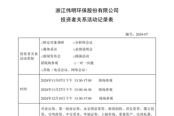 2024年12月11日,浙江伟明环保股份有限公司发布《投资者关系活动记录表》。图源:伟明环保公告 兴业证券、第一创业证券、永安国富资管、浙商创投、君弘资管、箴言投资、呈鸣投资、中交资本、华福证券、上柿咨询、重鼎资产、汉鸿私募、锐耐私募、嘉鸿私募、岙夏投资、中名资产、国融证券、恒择资本、汇恒力合基金、大罗山基金村、启元资产、浙江思考私...