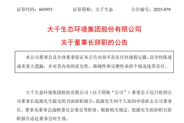 大千生态环境集团股份有限公司(简称:大千生态)公告称,公司董事会近日收到了董事长张源先生提交的书面辞职报告,张源先生因个人原因申请辞去公司董事长、董事及董事会战略委员会委员等职务。根据相关规定,张源先生的辞职自辞职报告送达董事会时生效。图源:大千生态公告 根据《公司章程》,大千生态将由副董事长段力平先生代为履行董事长职责,代行职责的...