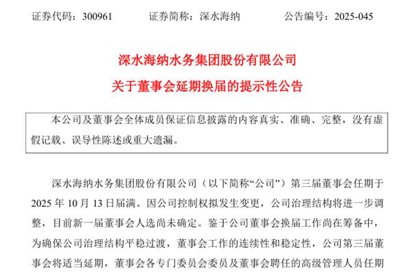 深水海纳水务集团股份有限公司(简称:深水海纳)近日公告称,因公司控制权拟发生变更,公司治理结构将进一步调整,目前新一届董事会人选尚未确定。鉴于公司董事会换届工作尚在筹备中,为确保公司治理结构平稳过渡,董事会工作的连续性和稳定性,公司第三届董事会将适当延期,董事会各专门委员会委员及董事会聘任的高级管理人员任期亦将相应顺延。 在换届选举...