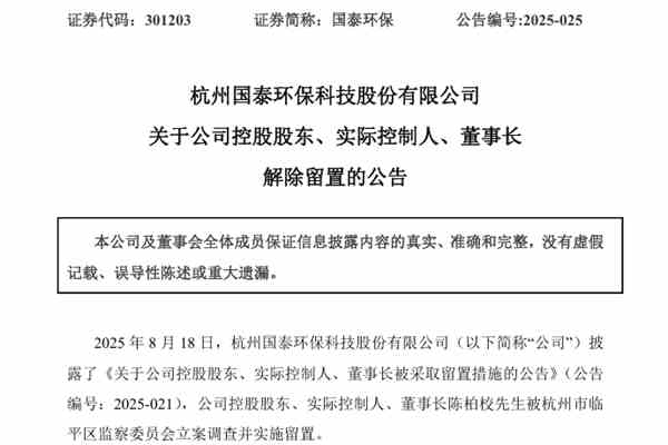 杭州国泰环保科技股份有限公司(简称:国泰环保)近日公告称,9月20日,公司收到陈柏校先生家属的通知,其收到杭州市临平区监察委员会出具的《解除留置通知书》,杭州市临平区监察委员会已解除对陈柏校先生的留置措施。目前陈柏校先生已能正常履职,董事、总经理夏玉坤先生不再代为履行公司法定代表人、董事长及董事会专门委员会委员等相关职责,公司生产经营...