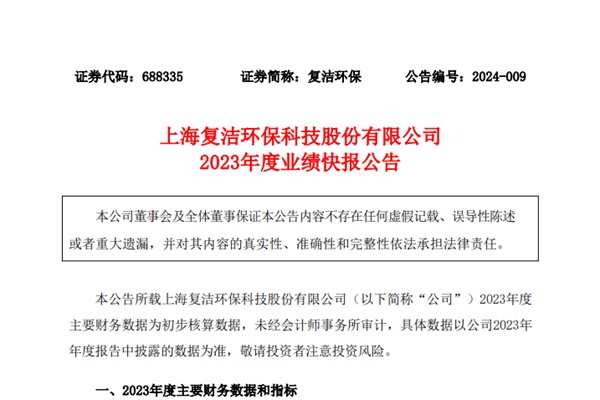上海复洁环保科技股份有限公司(简称“复洁环保”)日前公告《2023年度业绩快报公告》(全文见附件),在本报告期内,公司实现营业总收入57,608.23万元,较上年同期下降27.03%; 实现归属于母公司所有者的净利润10,134.01万元,较上年同期下降11.97%;实 现归属于母公司所有者的扣除非经常性损益的...
