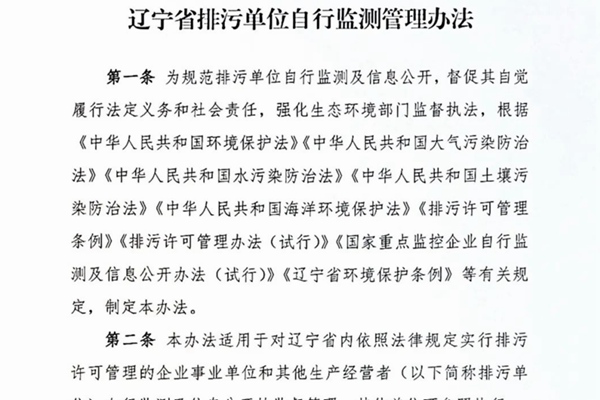 为规范排污单位自行监测及信息公开,强化生态环境部门监督执法,2023年10月30日,辽宁省生态环境厅面向社会公开发布了编制的《辽宁省排污单位自行监测管理办法》,文件于公布之日起施行。 文件适用于对辽宁省内依照法律规定施行排污许可管理的企业事业单位和其他生产经营者,办法所称的自行监测,是指排污单位按照环境保护法律法规要求,为掌握本单位...