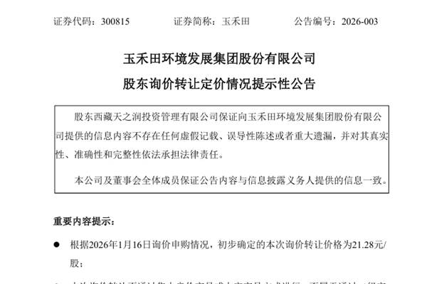 1月16日,玉禾田环境发展集团股份有限公司(简称:玉禾田)发布《股东询价转让定价情况提示性公告》,经向机构投资者询价后,初步确定的转让价格为21.28元/股。 参与本次询价转让报价的机构投资者家数为39家,涵盖了基金管理公司、证券公司、私募基金管理人、合格境外投资者等专业机构投资者。参与本次询价转让报价的机构投资者合计有效认购股份数...