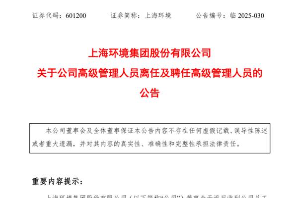 上海环境集团股份有限公司(简称:上海环境)公告称,董事会近日收到公司总工程师邰俊女士提交的书面辞职报告。邰俊女士因工作变动原因辞去所担任的公司总工程师职务,辞去上述职务后,将不再担任公司任何职务。截至本公告披露日,邰俊女士未持有公司股份,不存在应当履行而未履行的承诺事项。图源:上海环境公告 经公司独立董事专门会议审核,上海环境第三届...