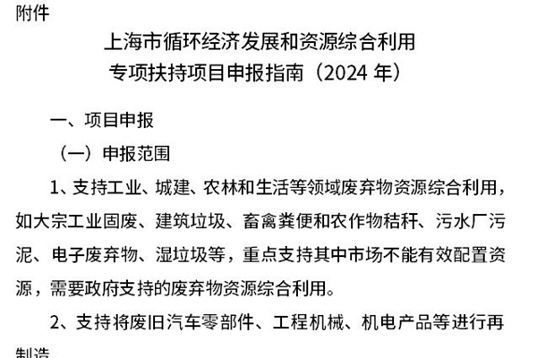 上海市发展改革委关于组织申报2024年循环经济发展和资源综合利用专项扶持项目的通知沪发改环资〔2024〕88号 市经济信息化委、市住房城乡建设管理委、市商务委、市农业农村委、市生态环境局、市水务局、市绿化市容局,各区发展改革委: 根据《上海市循环经济发展和资源综合利用专项扶持办法(2021版)》(沪发改规范〔2021〕13号,以下简称...