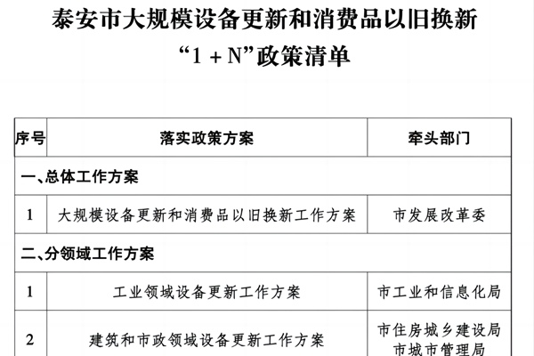 泰安市人民政府关于印发《泰安市推动大规模设备更新和消费品以旧换新工作方案》的通知 各县、市、区人民政府,各功能区管委会,市政府各部门、各直属机构,省属以上驻泰各单位: 《泰安市推动大规模设备更新和消费品以旧换新工作方案》已经市委、市政府同意,现印发给你们,请认真抓好贯彻落实。 泰安市人民政府 2024年5月31日泰安市推动大规模设...