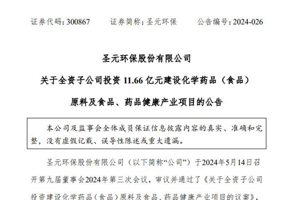 圣元环保股份有限公司(简称:圣元环保)近日公告称,全资子公司泉州圣元生物科技工程有限公司(下称“泉州圣元”)拟投资11.66亿元建设化学药品(食品)原料及食品、药品健康产业项目。 其中,化学药品(食品)原料项目首期计划投资7.49亿元人民币先行建设年产4万吨牛磺酸项目,以开展化学药品(食品)原料牛磺酸及相关产...