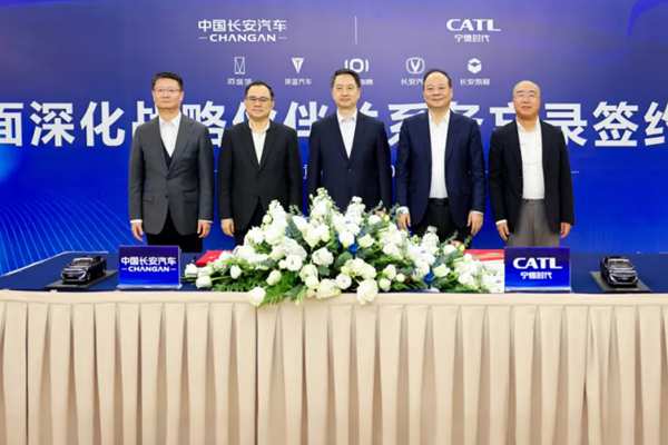 1月14日,中国长安汽车与宁德时代在重庆签署为期五年的全面深化战略伙伴关系备忘录,围绕技术应用、市场拓展、模式创新、海外布局及品牌传播等方向开展合作。中国长安汽车总经理赵非与宁德时代市场体系联席总裁韩伟代表双方签署,重庆市副市长郑向东、中国长安汽车董事长朱华荣、宁德时代董事长兼CEO曾毓群出席并见证签约。 中国长安汽车作为经国务院批...