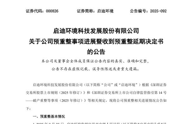启迪环境科技发展股份有限公司(简称:启迪环境)公告称,12月23日,公司收到宜昌中院出具的(2025)鄂05破申37号之一《决定书》,主要内容:“启迪环境科技发展股份有限公司临时管理人的申请符合《湖北省高级人民法院关于规范破产案件预重整审理服务经济高质量发展的工作指引(试行)》第十一条的规定,本院决定将启迪环境科技发展股份...