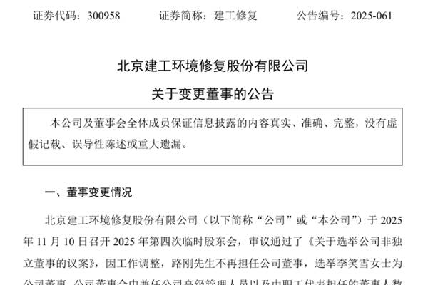 北京建工环境修复股份有限公司(简称:建工修复)近日公告,因工作调整,路刚先生不再担任公司董事,选举李笑雪女士为公司董事。公司董事会中兼任公司高级管理人员以及由职工代表担任的董事人数总计未超过公司董事总数的二分之一。路刚先生原定任期为2023年10月30日至2026 年10月30日。路刚先生离任后将不在公司及控股子公司担任职务。 建工...