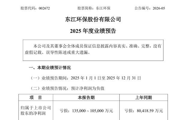 东江环保股份有限公司(简称:东江环保)近日发布《2025年度业绩预告》。报告期内,东江环保预计实现归属于上市公司股东的净利润亏损135,000 -105,000 万元,上年同期亏损80,418.59万元;扣除非经常性损益后的净利润亏损125,000 -95,000 万元;上年同期亏损80,976.81 万元;基本每股收益亏损:1.22...